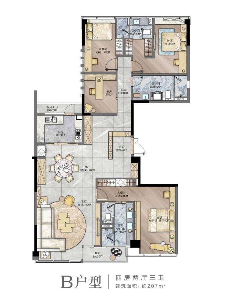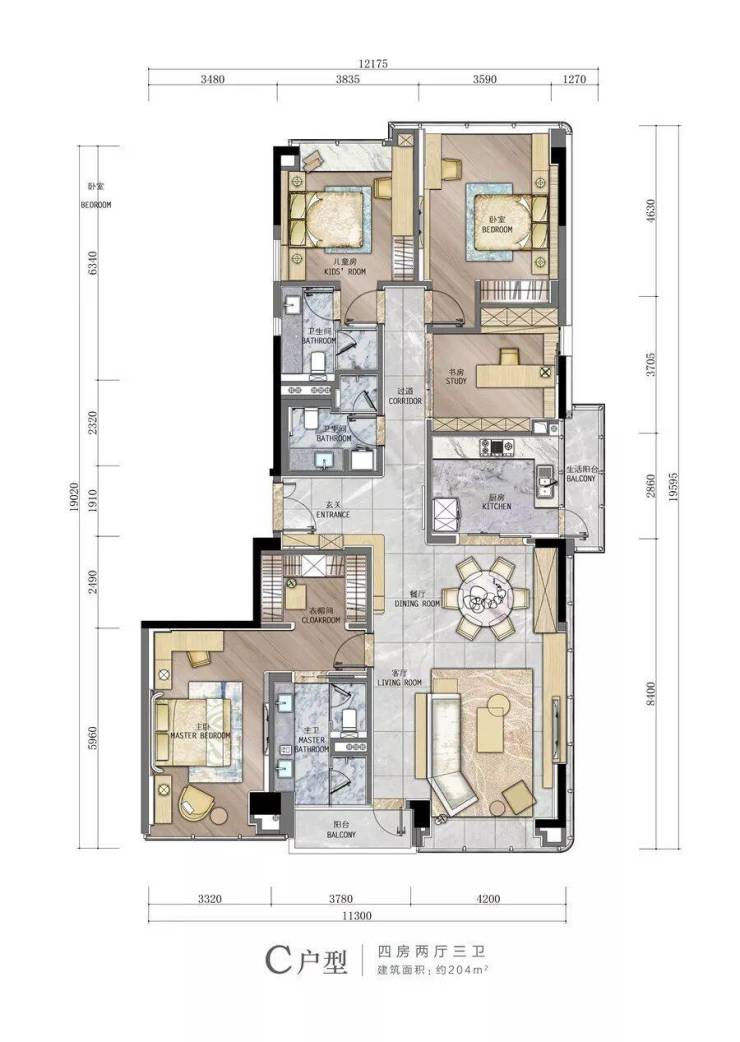 四个房间,尺度都不小,而且还有双套房设计,为家人留足私密空间。