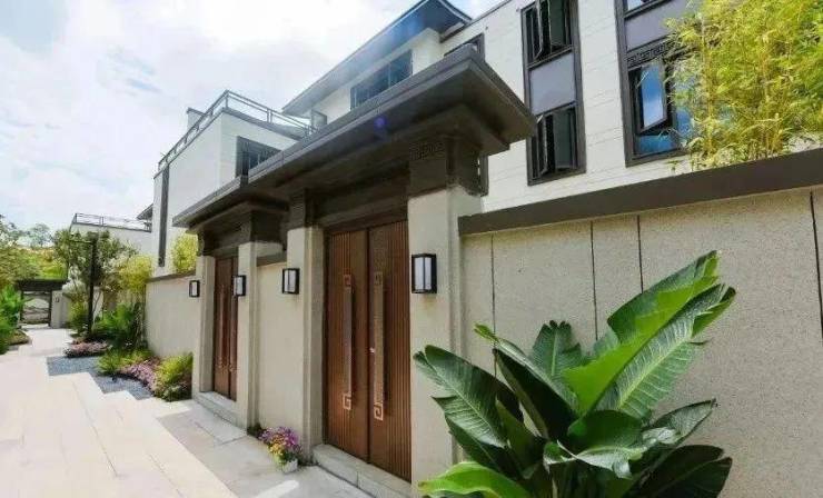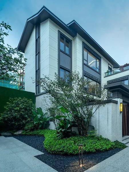 合院采用岭南设计风格,270°风光围合,用石材铺装,以草坪加灌木、乔木的方式创造出了多重立体植物的庭院空间,以石柱、月洞门等景观小品加以点缀。