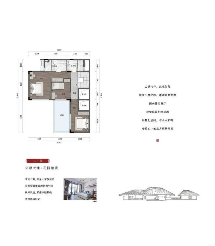 ➝二期园林:以“与山絮语,入林归居”为设计核心理念,结合传统东方院落的中式园林风格,采用台地方式设置奢阔景观面。