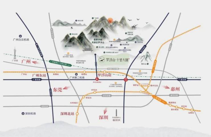 罗浮山·十里方圆项目距广汕高铁的罗浮山站仅500米,三站到广州东站,赣深高铁的规划使惠州到深圳仅需30分钟,山水城市,一键切换。