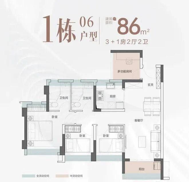3+1房设计让该户型在拥有三间卧室后,还预留一间与其他房间同等大小的多功能房间,无论是改造成老人房,还是打造工作室都拥有足够的空间,承载生活更多可能。