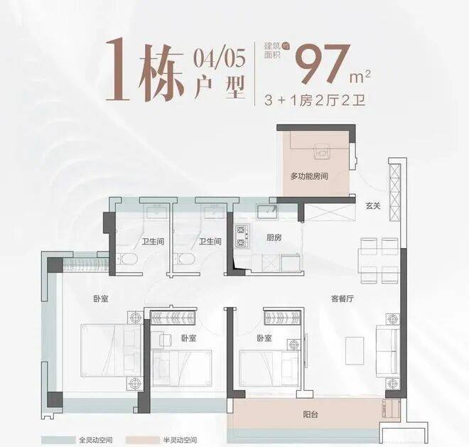 在户型布局上,97㎡在85㎡-86㎡的基础上做出升级版3+1房设计,打破同等面积户型的“大小房”设计,除主人套房外,各次卧面积均等且室室皆享阔意,兼顾每一位家庭成员的居住体验,无论是多孩家庭,还是三代同堂,每一种家庭结构都能完美适配。