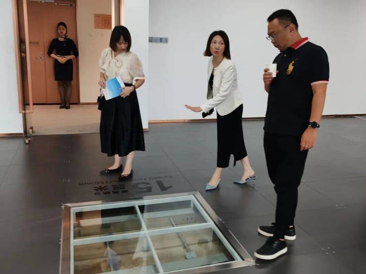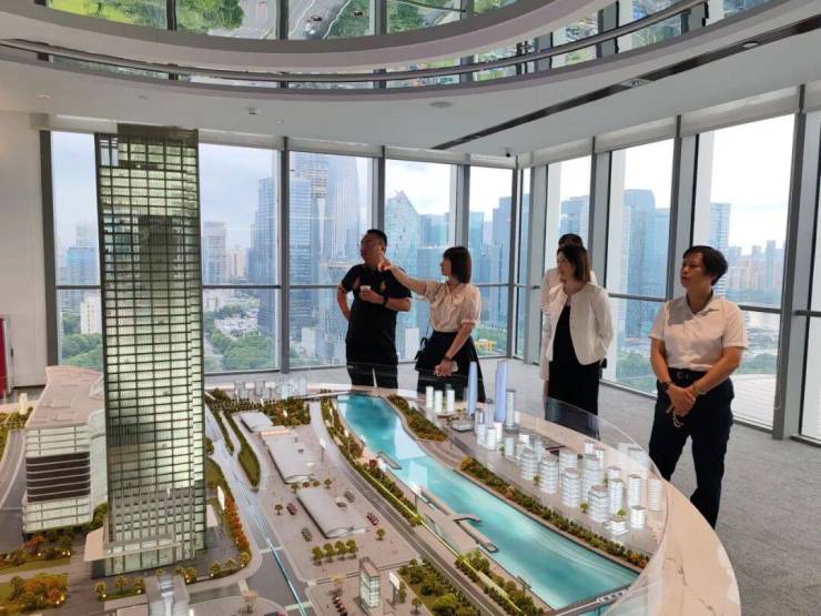 在参观过程中,讲解员介绍了项目的景观特色,琶洲公馆拥有罕见的南北双江景观,38-47层的企业会客厅采用超大尺度LOW-E落地玻璃幕墙,带来360°环幕视野,能很好地欣赏江景与城市景致,将江景与城市天际线尽收眼底,站在45层的云端空中露台,可直观感受“无界人生”的开阔意境。