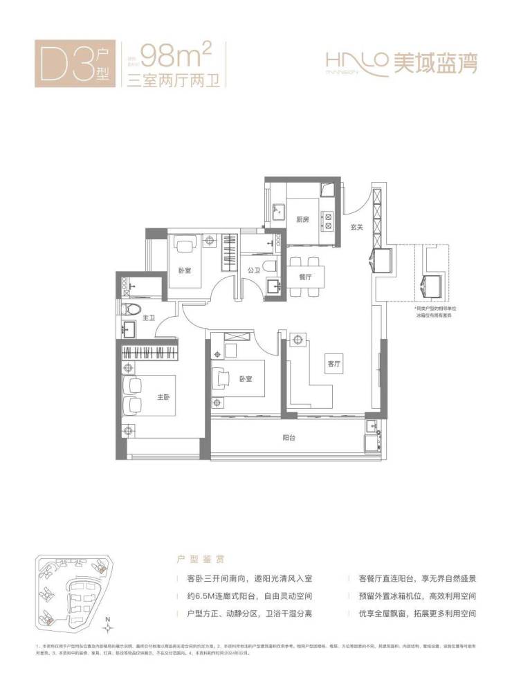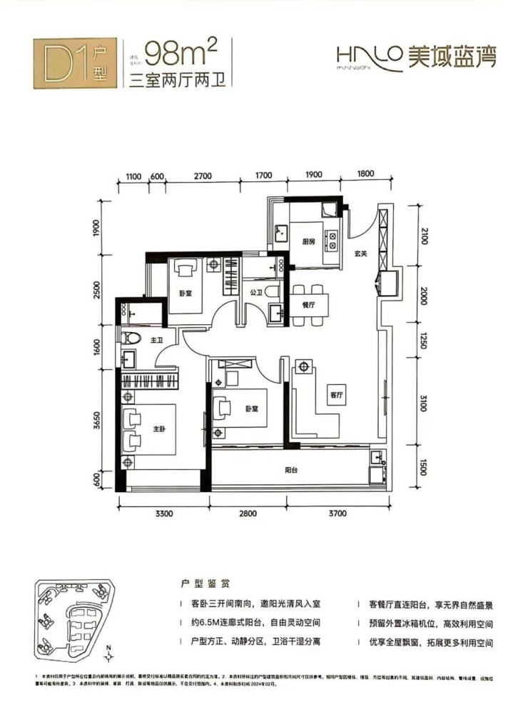 D1户型-98㎡的3房2厅2卫,设计的是竖厅格局,客厅连接次卧出阳台(有6.5米长),三开间朝南,S墙设计预留冰箱位,U型厨房,得房率:80.12%(不含赠送),有西南向或东北朝向。