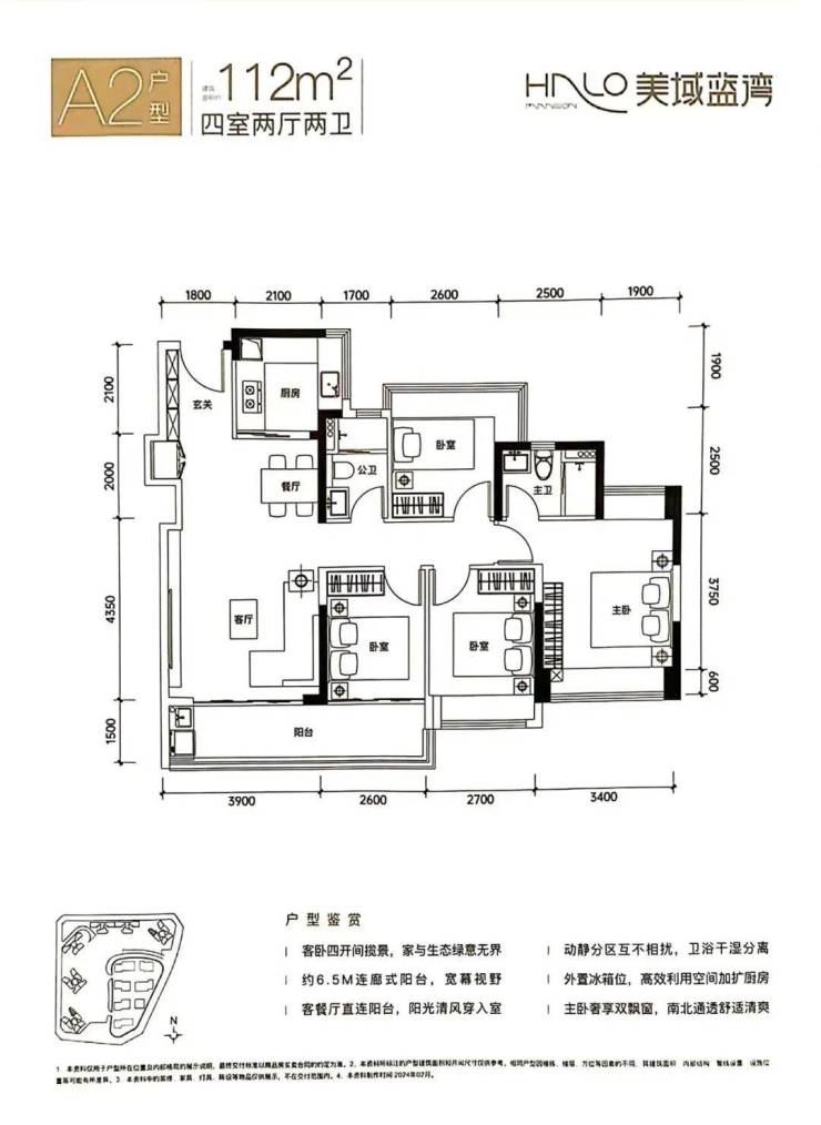 A2户型-112㎡的4房2厅2卫,设计的是竖厅格局,客厅连接次卧出阳台(有6.5米长),四开间朝南,S墙设计预留冰箱位,主卧双飘窗南北对流,U型厨房,得房率:80.12%(不含赠送),有西南或东北朝向。