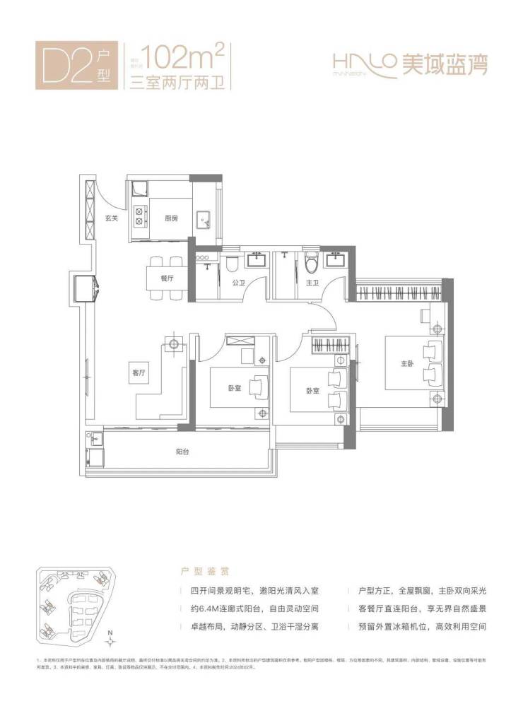 D2户型-102㎡的3房2厅2卫,设计的是竖厅格局,客厅连接卧室出阳台(有6.4米长),四开间朝南,S墙设计预留冰箱位,主卧双飘窗南北对流,U型厨房,得房率:80.11%(不含赠送),有东北向或西南朝向。