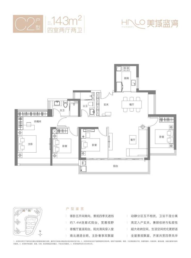 143㎡的4房2厅2卫,C2户型,设计的是竖厅双龙抱珠格局,进门入户玄关,客厅4.4米开间,LDKB一体化设计,五开间朝南,4个卧室分别做到了主卧22.04㎡/次卧11.48㎡/次卧10.8㎡/次卧9㎡(包含墙体飘窗),客厅连接次卧出7.4米长的巨幕大阳台,U型厨房,卫生间干湿分离,得房率约77.13%(不含赠送),正南朝向。
