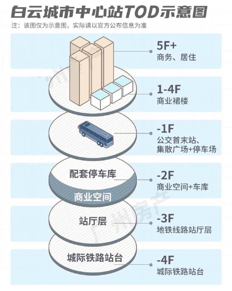 约7万㎡的白云城市中心站场综合体,整个站场以垂直立体式的TOD模式打造,涵盖地下商业空间、停车场、公交车首末站、集散广场,以及多层的商业裙楼。