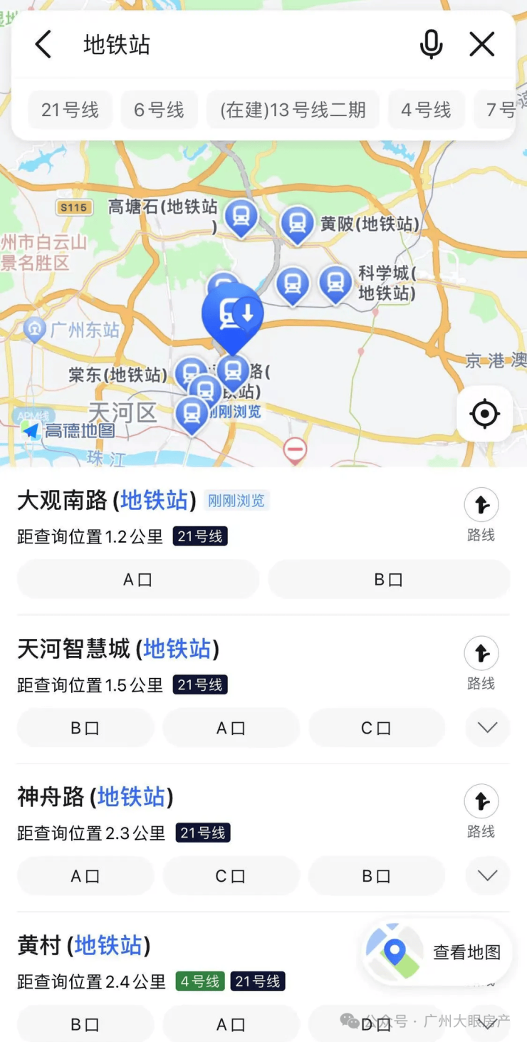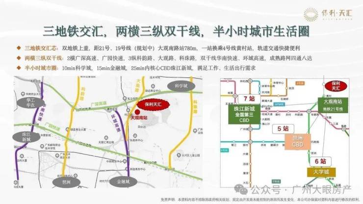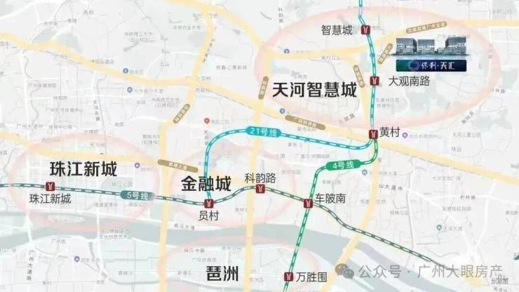项目距离21号线大观南路站约1.2公里,步行大概需要15分钟,建议买个小电车接驳,一站换乘4号线去往金融城、琶洲,4站到员村换乘5号线直抵珠江新城。