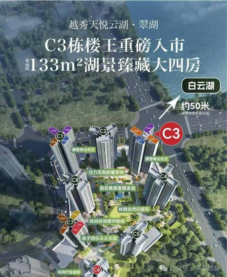 越秀·天悦云湖由国企越秀地产打造,坐落白云湖数字科技城核心,以“一线湖景+地铁口+广附名校”为核心优势,成为主城湖居刚需与轻改善首选。总建面约45.7万㎡,绿化率35%,推窗即览约3000亩白云湖,社区配云端泳池与千平草坪,国企精工保障交付,精装准现,无烂尾隐忧。