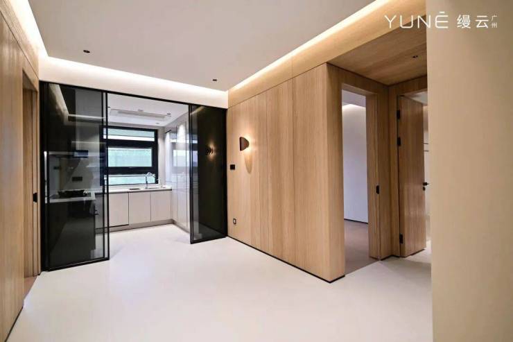 室内原木结构的加入为空间增添一抹温暖。木饰面的自然纹理与温润质感,执行缦品牌标准,历经100多次打样,最后选出视觉最舒服的“小山纹”橡木。淡雅的色彩更具兼容性,以不同的材料、纹理和样式的组合,和谐穿插在室内动线的视觉呈现中,形成简洁、明快又柔和的氛围,更为软装搭配预留充足的发挥空间。