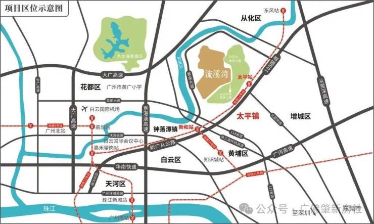 该项目东南临近G105国道(新广从路)和地铁14号线,西南靠S118省道,西侧距离北兴高速3公里,30分钟可到白云国际机场,20分钟可到中新知识城。