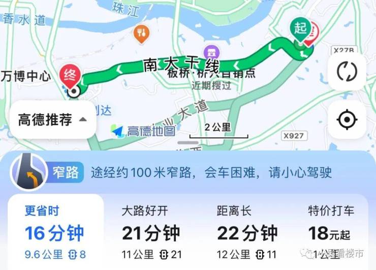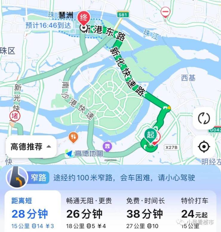 自驾去珠江新城:南大干线到万博转新光快速路,再接猎德大道,全长24公里,耗时40分钟。