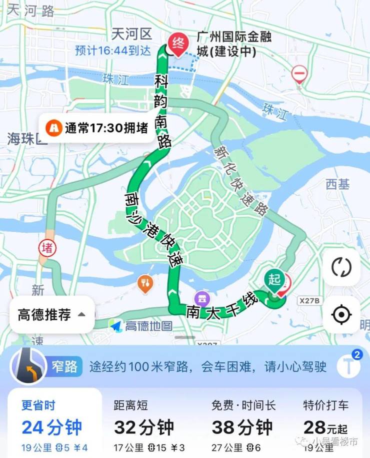 自驾去金融城:出来小区走南大干线转南沙港快速,再转科韵路,全长19公里,高速费4元,耗时24分钟。