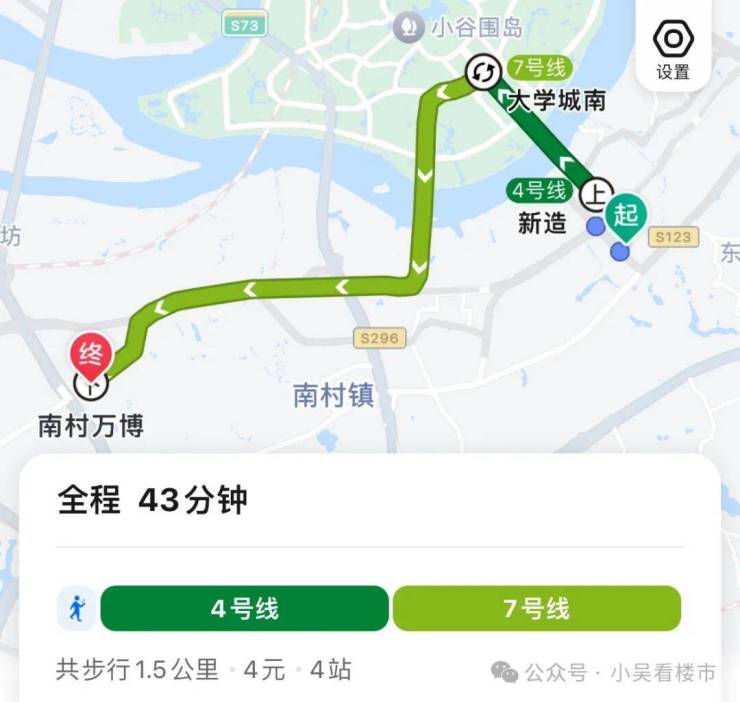地铁去往万博:出小区步行至新造站,乘坐4号线到大学城南换乘7号线,再到万博,全程4个站,耗时43分钟左右。