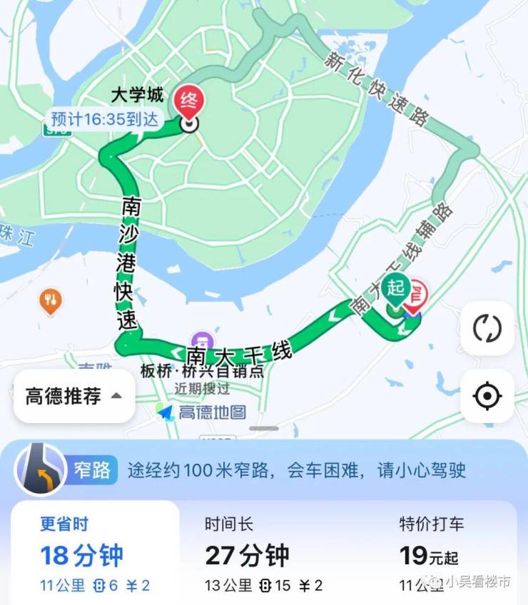 自驾去大学城:南大干线转南沙港快速,全长11公里,高速费2元,耗时18分钟。