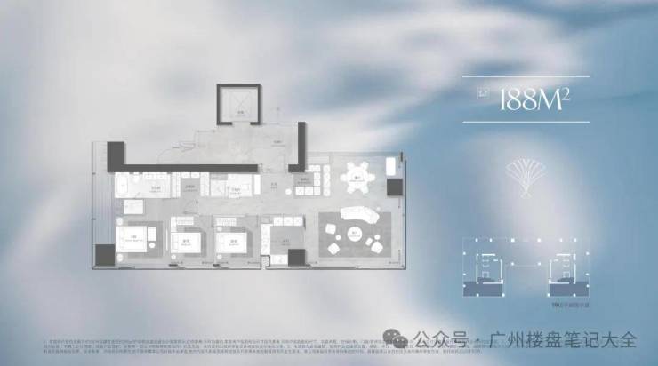 户型设计是项目的核心卖点,主推 188-1400㎡商业大平层,4-4.5 米层高设计,空间感突出。