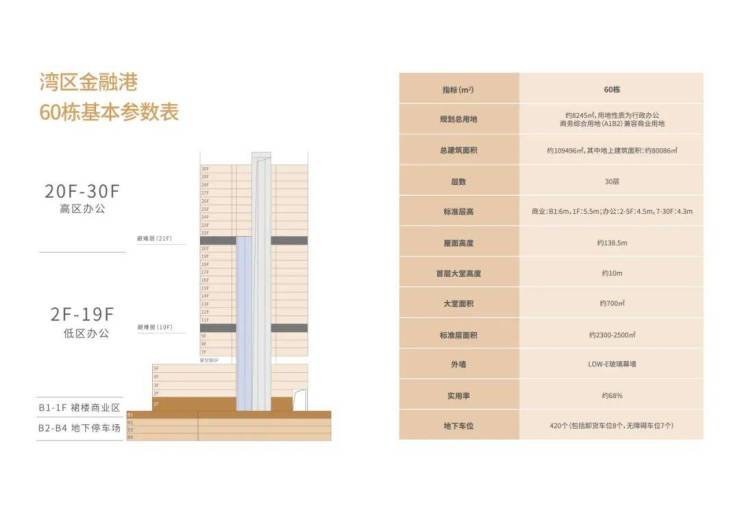 在硬件的营造上,项目总建筑面积约11万㎡,标准层面积约2300-2500㎡,均按照超甲级写字楼标准打造,层高约4.3~4.5米,大堂10米挑高。项目内部配备VRV空调系统、12部高效智能电梯、超白LOW-E夹层玻璃等顶级硬件配置。