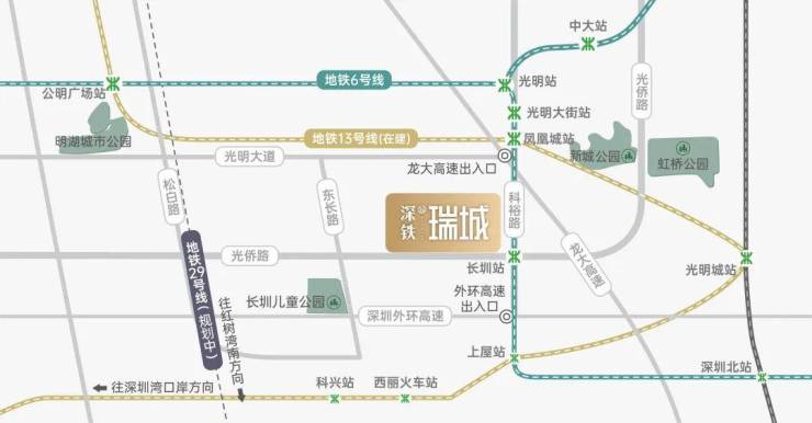 临近光明城综合交通枢纽,连接广深港高铁与赣深高铁,未来将引入13号线(在建)、地铁6号线支线二期(在建)及深莞增城际(规划)。
