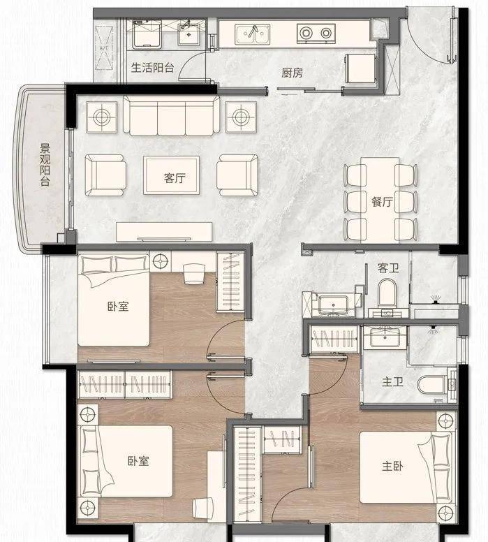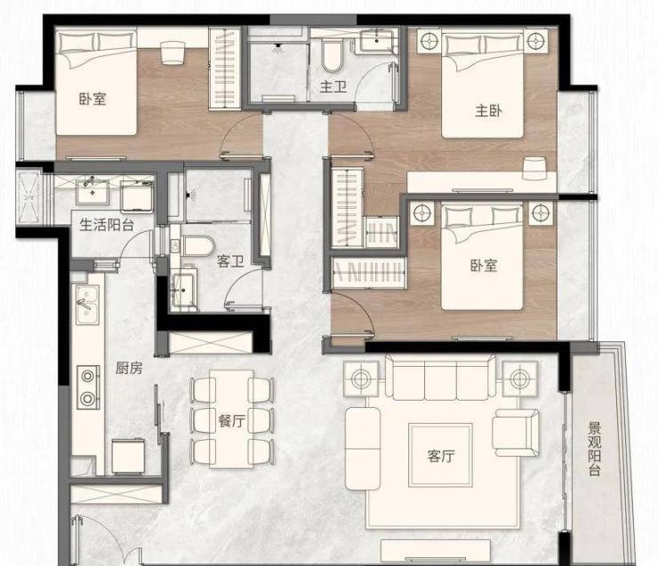 建面117平三房,这个户型阳台飘台都比较大,视野比较广,客卫三分离设计,主客分明。