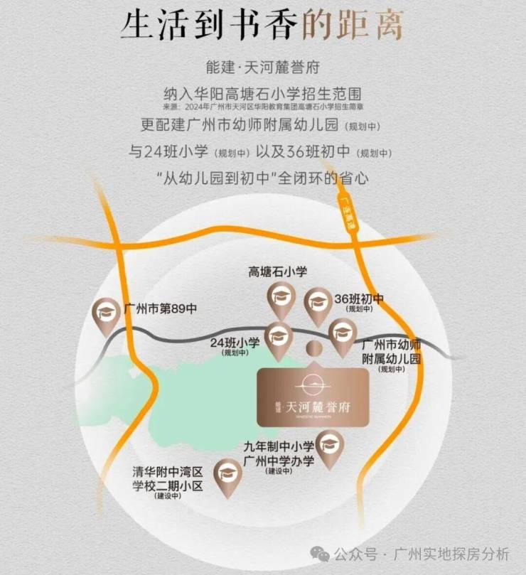项目旁配建 9 班省一级幼儿园(由广州幼师附属幼儿园承办);斜对面高塘石小学已加入华阳教育集团(派骨干师资进驻),3 年内将从 12 班扩建至 24 班;初中 2024 年对口直升省一级 89 中,亦可摇号天河执信、天河湾区实验学校。