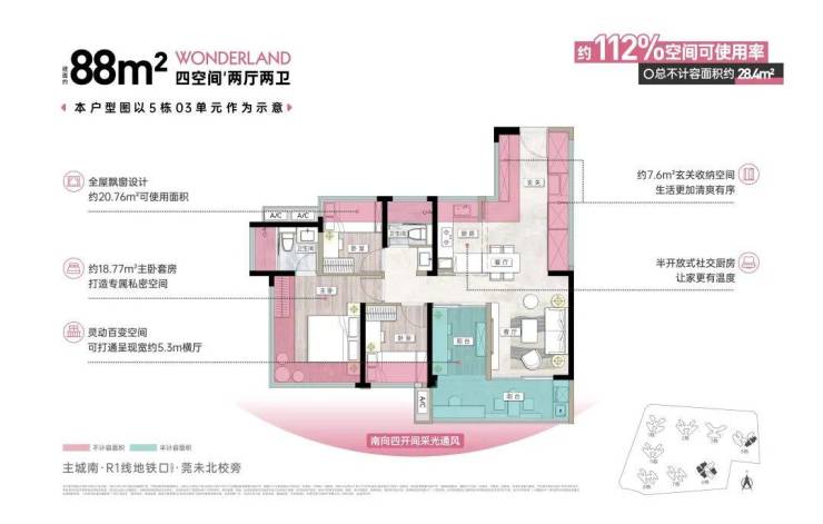 空间可使用率高达约112%,总不计容面积约28.4㎡,相当于一个主卧套房的面积。