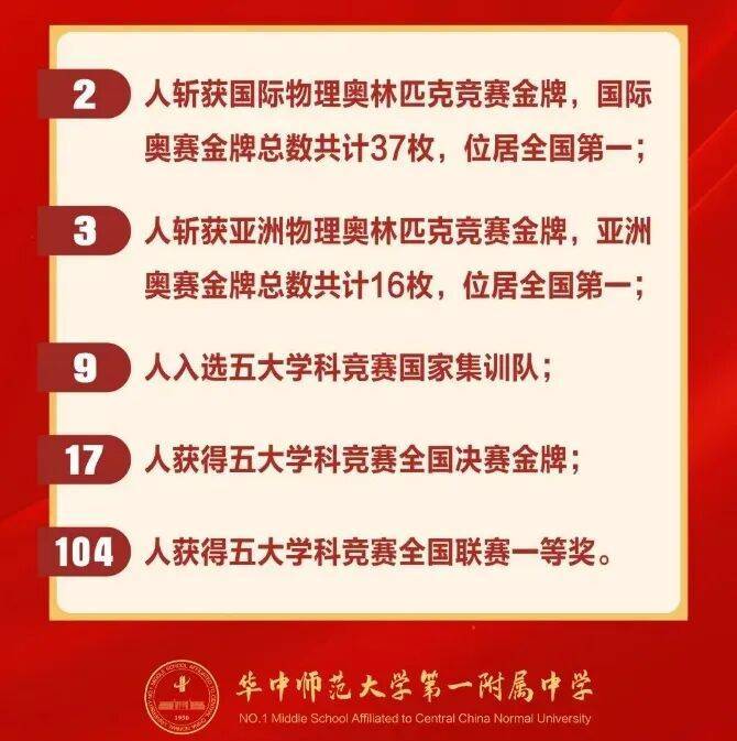 截止2023年,华中师大一附中在国际、亚洲物理奥林匹克竞赛中,分别获得金牌37枚、16枚,均位居全国第一,妥妥的战力天花板(来源:华中师范大学附属第一中学)。