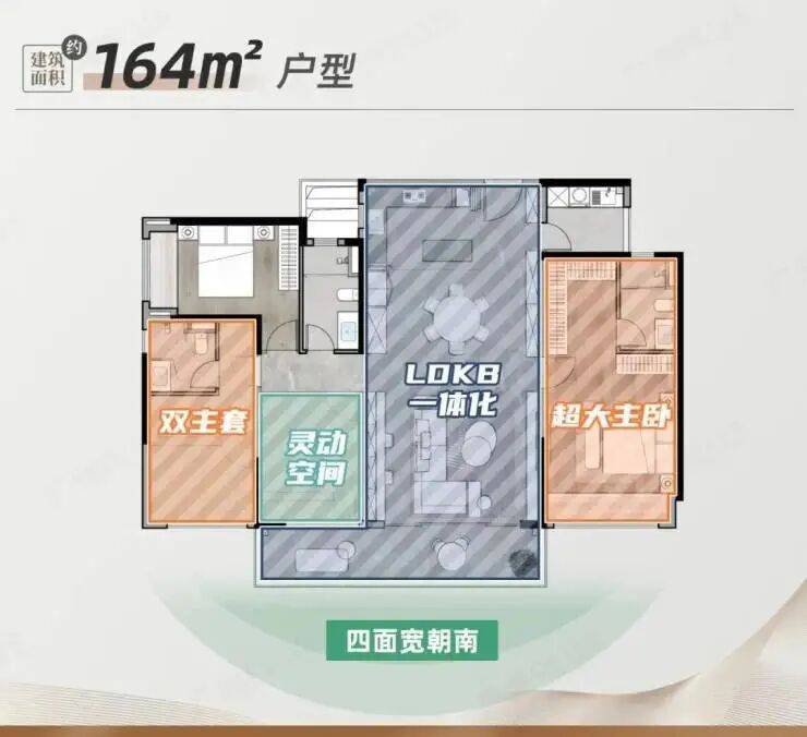 164㎡位于整栋楼的正前方,可视范围最大。该户型特别之处是做到双套房设计,LDKG大方厅+中/西双厨+南北双阳台,灵动空间可以改为书房/卧室/茶室,完全能满足改善客户的置换需求。