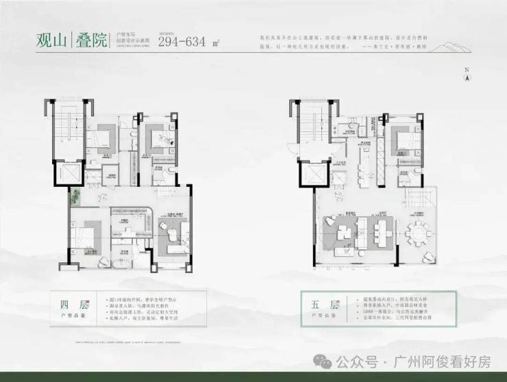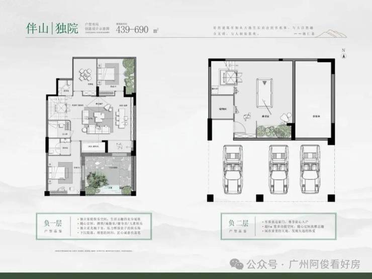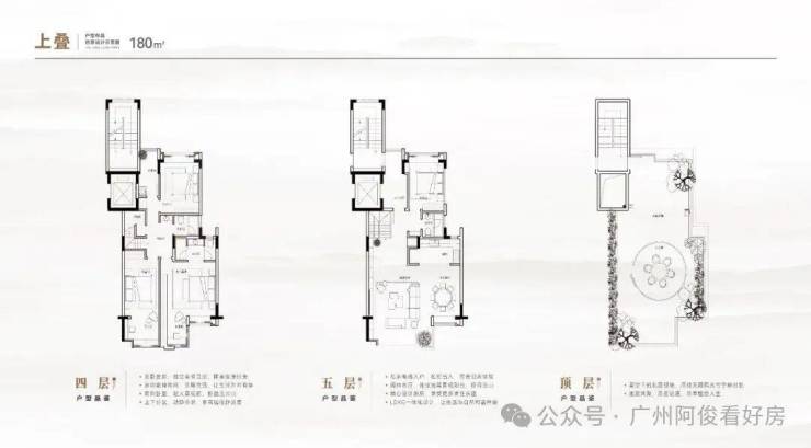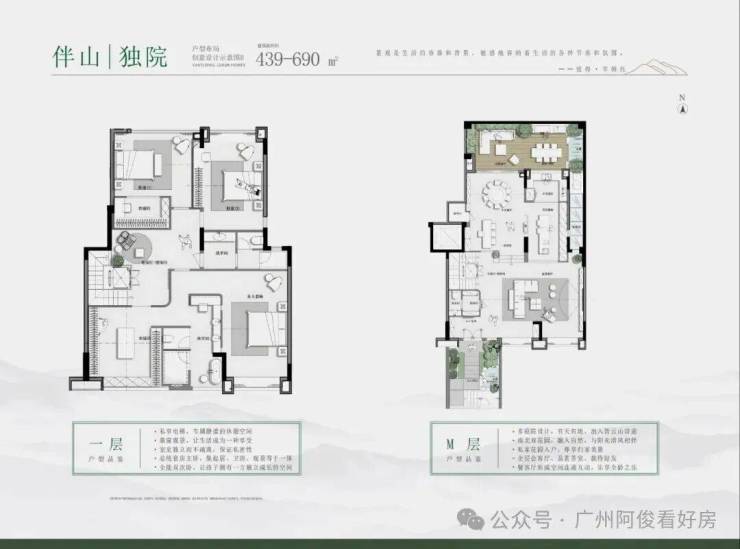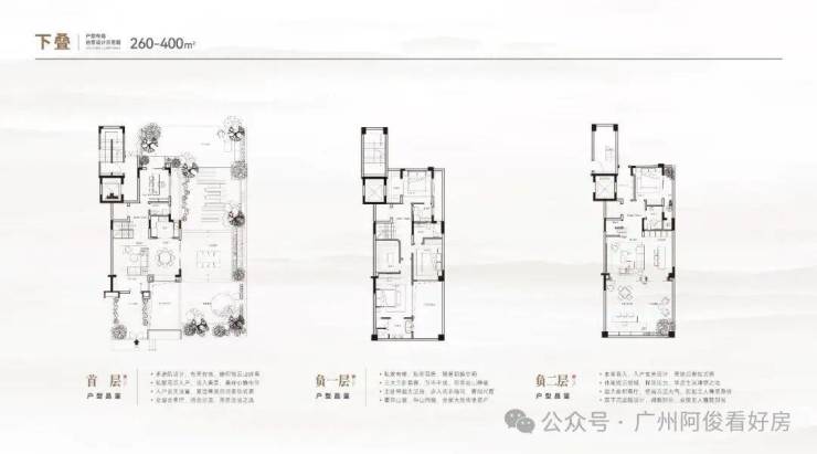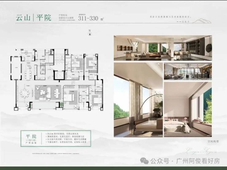 主力户型为180-690㎡大平层及叠院,部分户型带私家花园、星空露台,如311-330㎡大平层拥22米南向面宽,山湖双景入室。