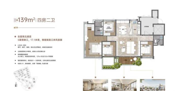 一线头排的观江视野,户内五面采光,私享约20米观江界面。错层通高的阳台,为业主带来类四代宅的奢阔尺度。专梯专户的尊崇享受,LDK一体化社交客厅、阔绰主卧套房,兼顾仪式感与实用性。
