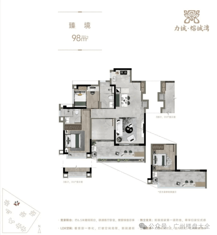 建面约97㎡,江园双景臻席,不仅能欣赏花地湾江面卓绝风光,还能俯瞰榕诚公园,以及GVL怡境国际匠心打造的“山林麓畔 隐翠森居”主题大师园林,LDK餐客厨一体设计,约6.5米宽境阳台。