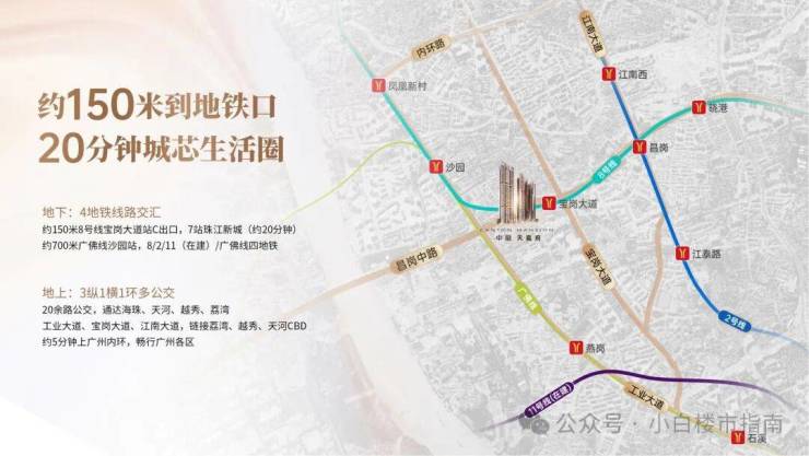 项目距离地铁8号线宝岗大道C出口仅150米,步行只需要3分钟,是个妥妥的地铁盘,乘坐8号线,1站转广佛线,4站到荔湾,7站到天河。