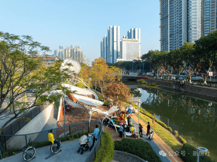 多样化的植物组合与季节变换的色彩,增强城市的生态多样性和观赏性。于外,环绕众多公园,有约2.5公里滨水绿带,还有27公顷立体生态空间,形式丰富多变。