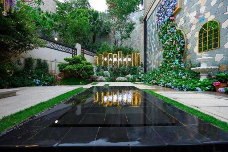 重金工法造园,采用黄蜡石打造园林水景,错落有致,移步换景。甄选全冠移植香樟树、约300年十八学士白茶花、非洲加拿列海枣树和多种季节性水果树,点缀四时山色,尽享四季盛景。