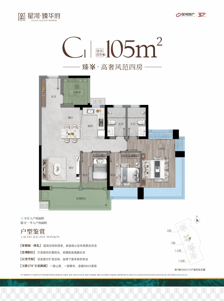 建面约125㎡雍容轩敞四室,约100%使用率 迎宾入户花园,宽幕景观阳台 270°瞰景飘窗主卧。