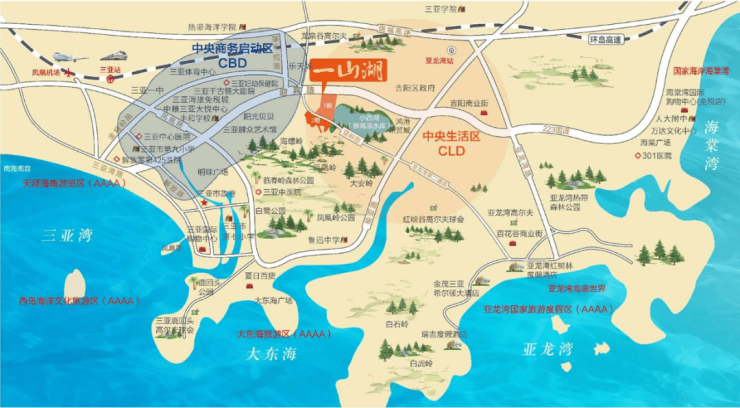 生态配套——海螺岭、凤凰岭、大安岭、白石岭、白虎岭、4A级景区椰梦长廊三亚湾、4A级景区大东海、4A级景区亚龙湾、4A级景区国家海岸海棠湾。