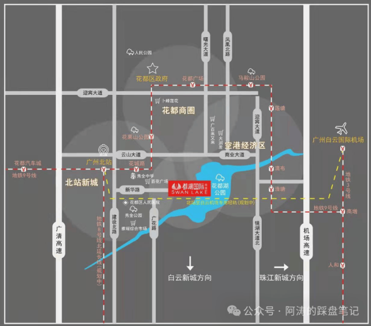 项目距地铁9 号线花果山公园站、花城路站仅约 800-1000 米,步行约 10 分钟即可直达。乘坐 9 号线,可快速换乘地铁 3 号线、8 号线,无缝连接珠江新城、体育西、白云新城等广州核心商圈与 CBD。未来更有规划中的18 号线北延线、24 号线等多条地铁线路环绕,届时将进一步缩短与主城核心区的时空距离,通勤效率再升级。
