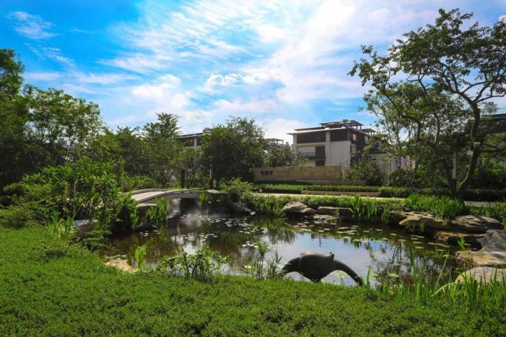 其承大国之院落,取云山之厚重,打造现代版履道坊——花溪谷,绿植山体环绕,重点打造瀑、潭、溪、涧、湖等不同形态的水景,配以桥、亭、阶、坡景成就一座院藏云山的大美园林。