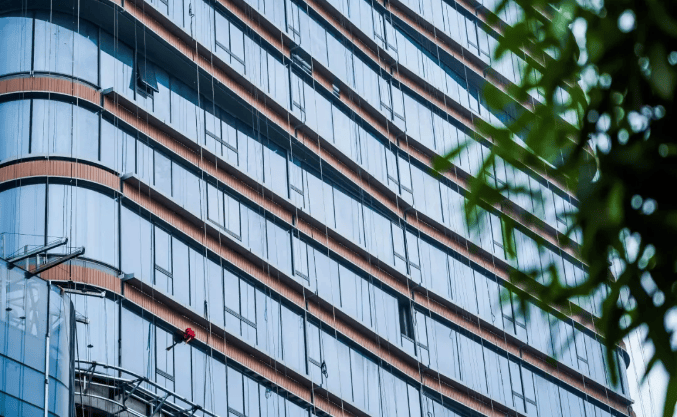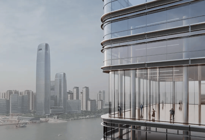 外立面采用木色陶板与全景玻璃幕墙,以“曲水流觞”的涟漪造型呼应珠江文脉,同时融入垂直生态理念,打造空中绿岛与可呼吸的建筑肌理。