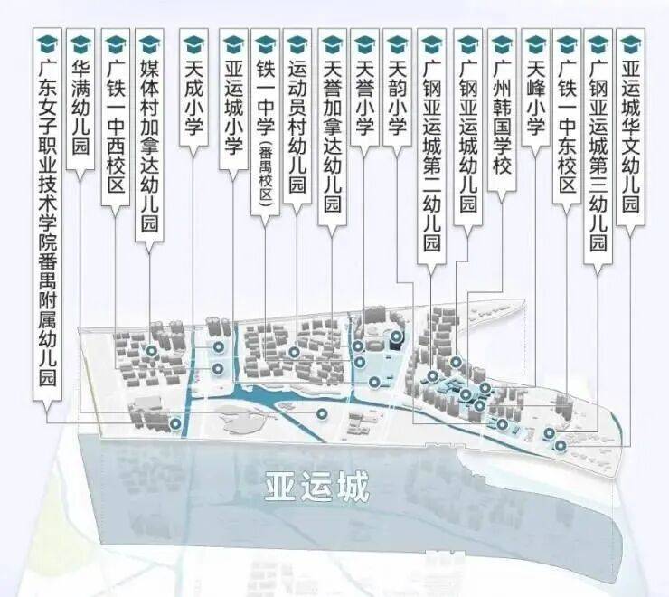 名校矩阵:片区坐拥19 所已开学公办名校,含 4 所省一级广铁一中(亚运城校区)、9 所公办幼儿园、5 所公办小学、1 所公办初中,教育资源密度广州罕见。