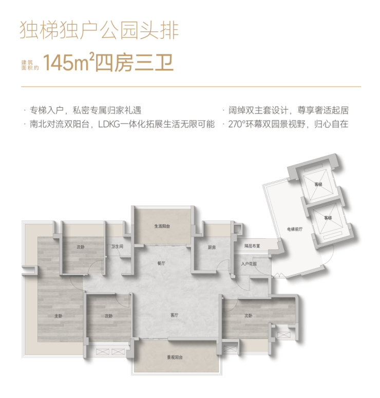 专梯入户,私密专属归家礼遇;南北对流双阳台,LDKG一体化拓展生活无限可能;阔绰双主套设计,尊享奢适起居;270°环幕双园景视野,归心自在。将所有向往,在此沉淀为可触摸、可生活的真实。