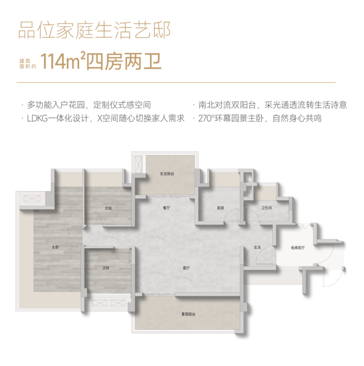 多功能入户花园,定制仪式感空间;LDKG一体化设计,X空间随心切换家人需求;南北对流双阳台,采光通透流转生活诗意;270°环幕园景主卧,自然身心共鸣。在繁华之中,归于内心的从容。