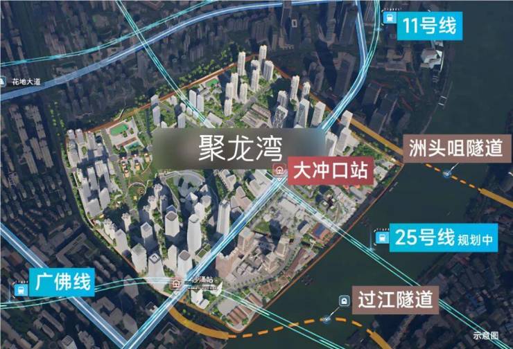 交通方面,聚龙湾踞守广佛极点,约200米直达11号线大冲口站,快速接驳内环路与环城高速,双城生活不过一站之隔。