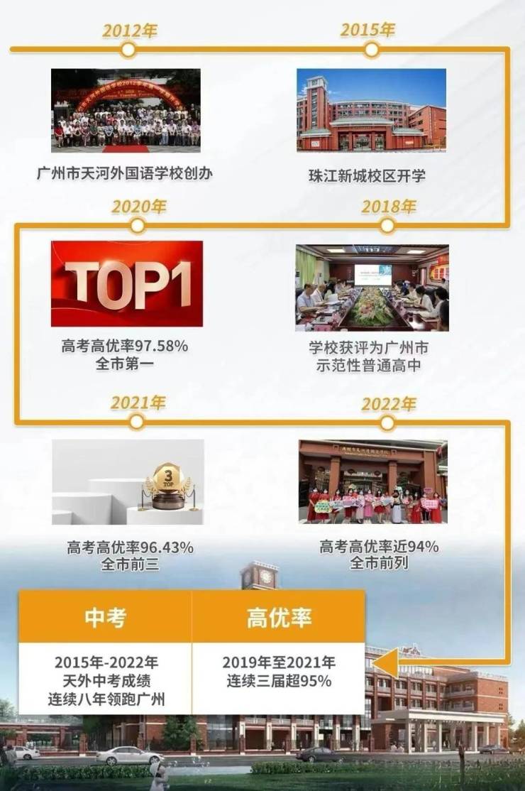 广州天河外国语学校自2012年4月创办以来, 学校迅速成长为广州优质教育品牌;同时享有北京大学大学先修课程实施学校、广州市教育工作先进集体等多项称号。