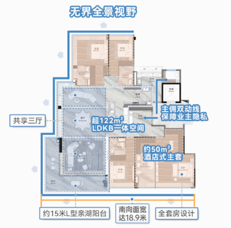 约18.9米南向面宽,奢阔层高享受,约122方定制化多功能社交巨厅,15米转角阳台,一线观湖