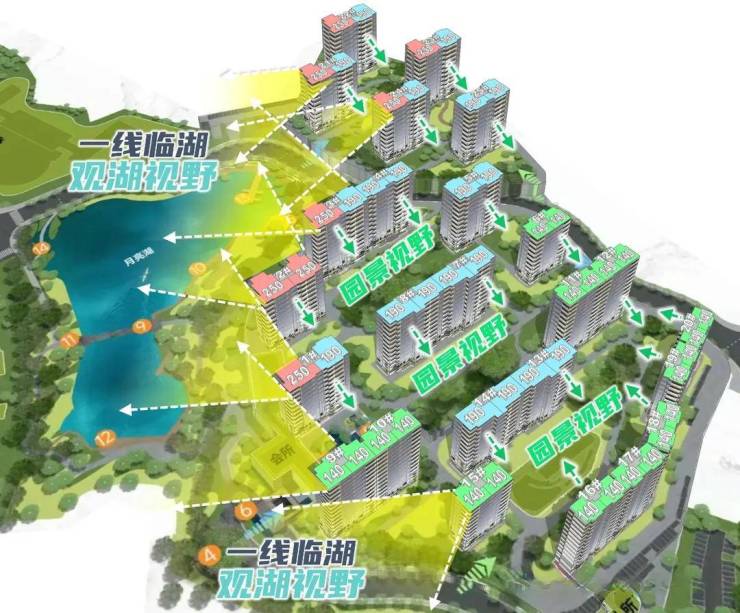 45-52米的低密度小高层,按照“前低后高”的建筑高度控制,形成朝向湖区梯级跌落的设计,大地块西北向望湖景,小地块西向往湖景。