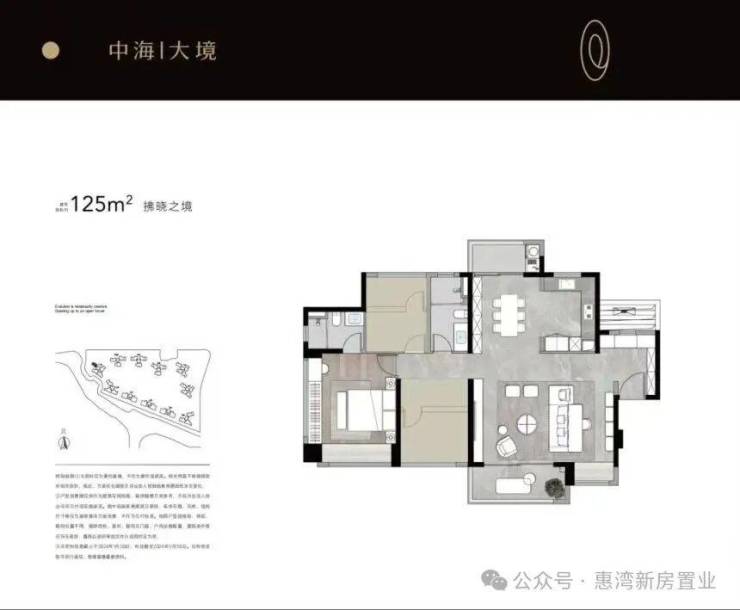 其中,125㎡三房两卫采用南北对流设计,客餐厅一体化连接 6 米景观阳台