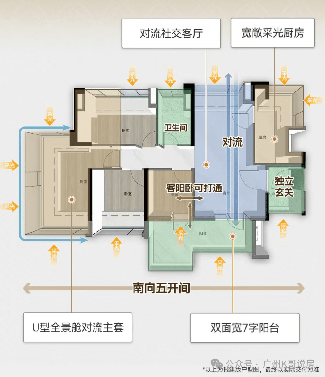 客餐厅、主卧套间是真正的南北对流,不是伪对流,还有超长阳台,实用满分。