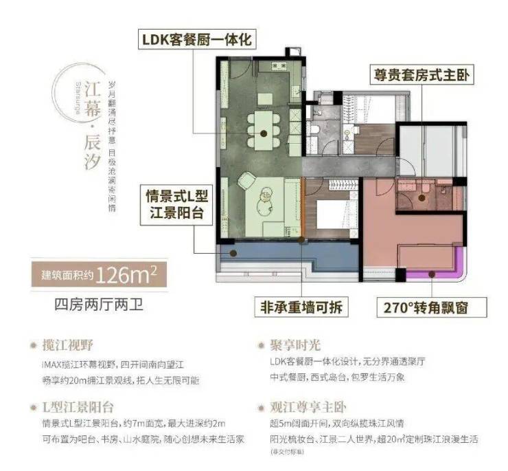 江幕·辰汐126㎡ 四房两厅两卫270°环幕视野,5开间南向望江,畅享约20m拥江景观线 LDK客餐厨一体化,无分界通透聚厅L形江景阳台,约7m面宽,最大进深约2m观江超级主卧,定制江景梳妆台,超5m阔面开间,双向纵揽珠江风情