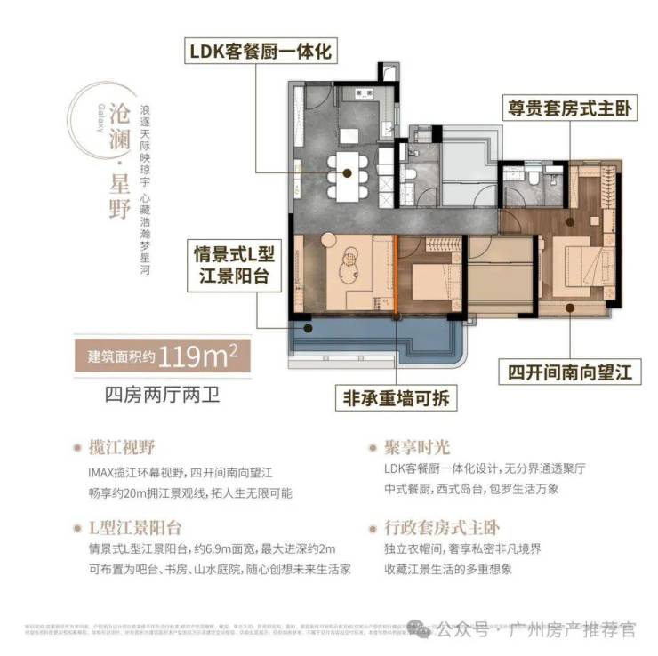 沧澜·星野119㎡ 四房两厅两卫270°环幕视野,四开间南向望江,畅享约12m拥江景观线LDK客餐厨一体化,无分界通透聚厅L形江景阳台,约6.9m面宽,最大进深约2m行政套房式主卧搭配独立衣帽间,收藏江景生活的多重想象